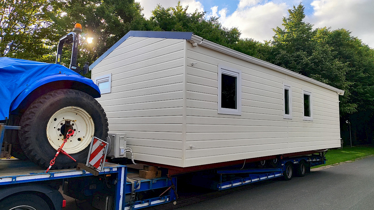La livraison du chalet sur notre site près de la mer du Nord a également été impressionnante. Les manœuvres dans des voies d’accès étroites et des virages apparemment impossibles ont été réalisées avec un grand savoir-faire.