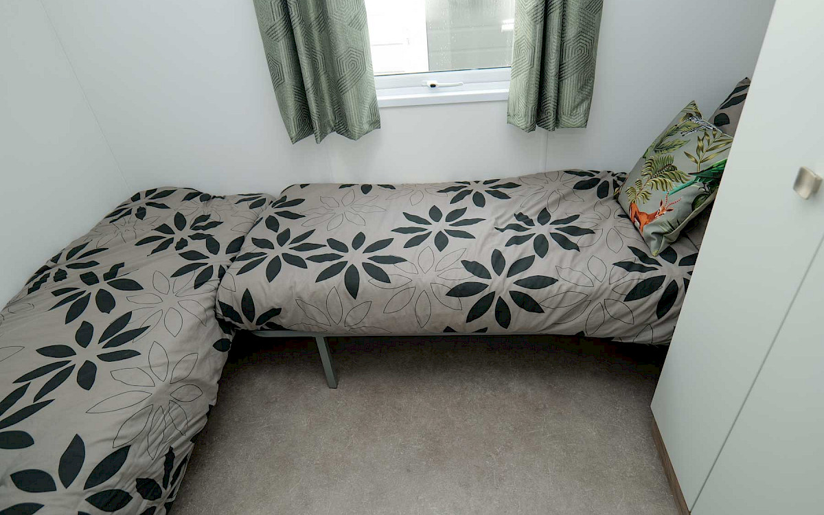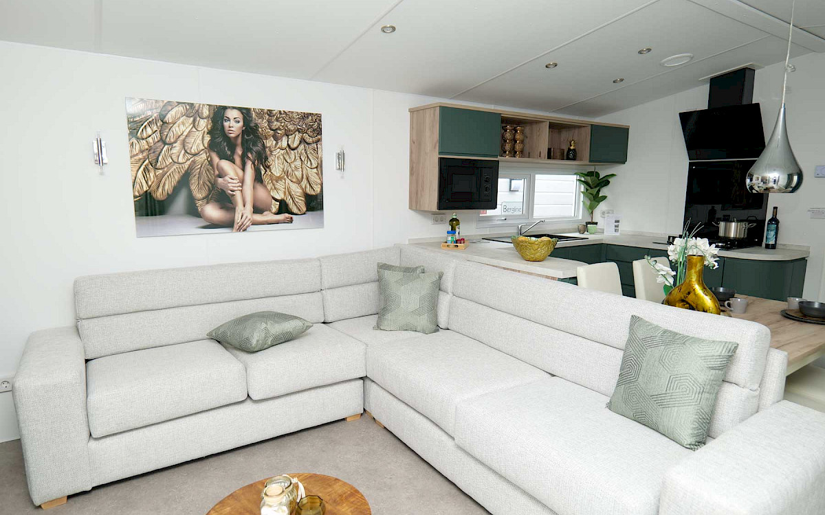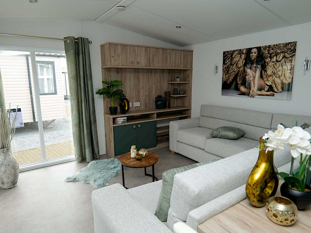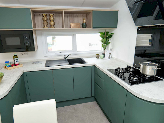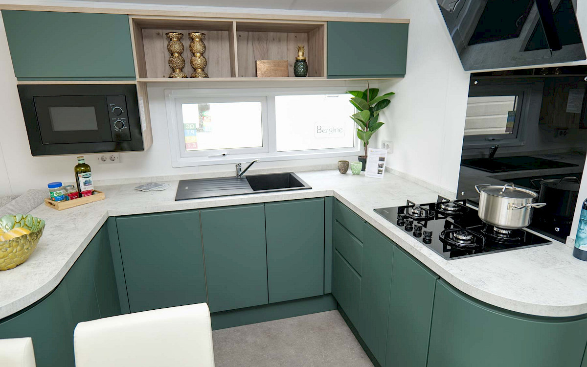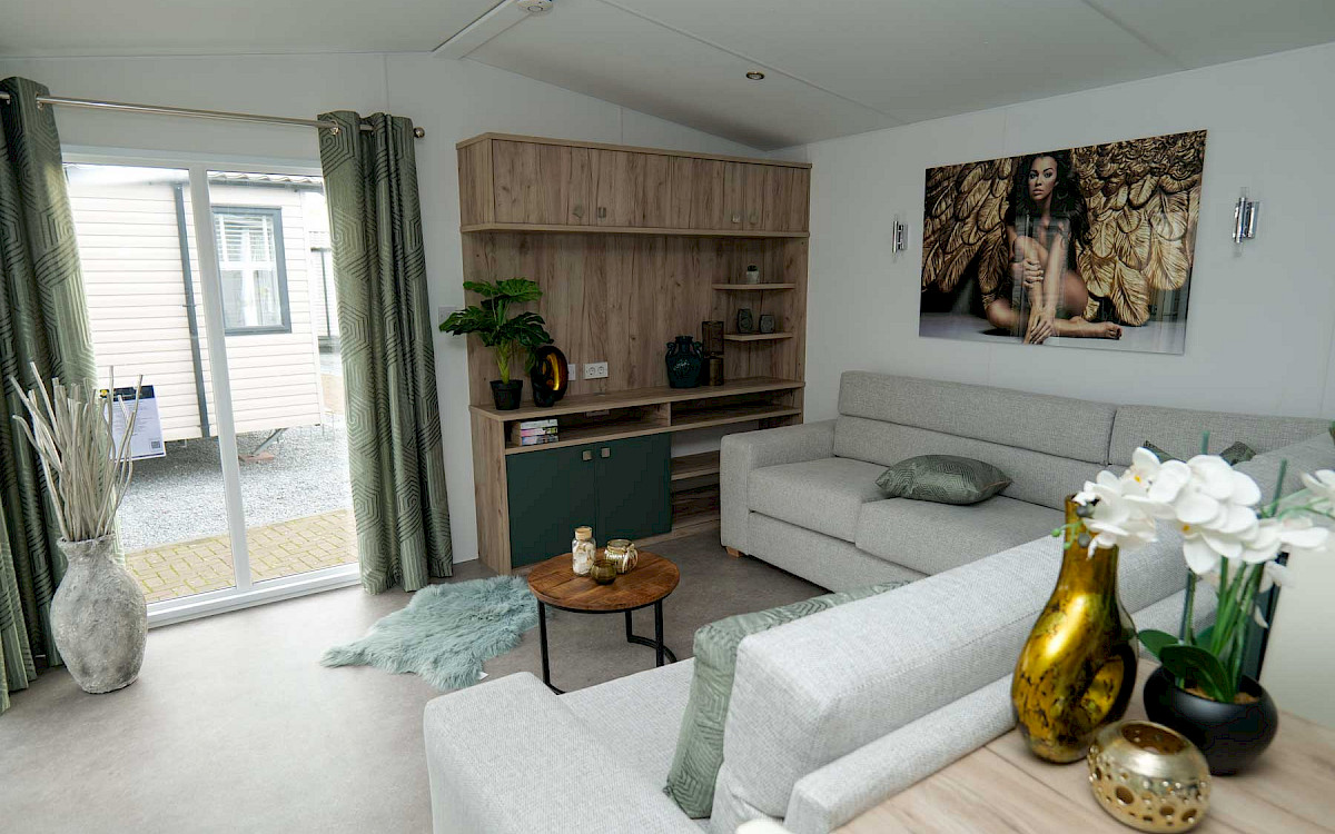 La série Bergjes spéciale Atlantis est un bel ajout à notre gamme. Ce modèle présente un revêtement extérieur gris clair avec des cadres anthracite. La cuisine a une couleur vert foncé chic et est équipée d'une bande LED ! Le grand canapé d'angle est parfait pour une agréable soirée entre amis ou en famille. Et les grandes fenêtres d'angle offrent une belle vue sur votre parc de vacances. Le séjour est séparé des chambres, de la salle de bain et des toilettes séparées par une porte communicante. Bref, la maison de vacances idéale ! Curieux? Venez vite découvrir ce modèle sur notre terrain d'exposition.