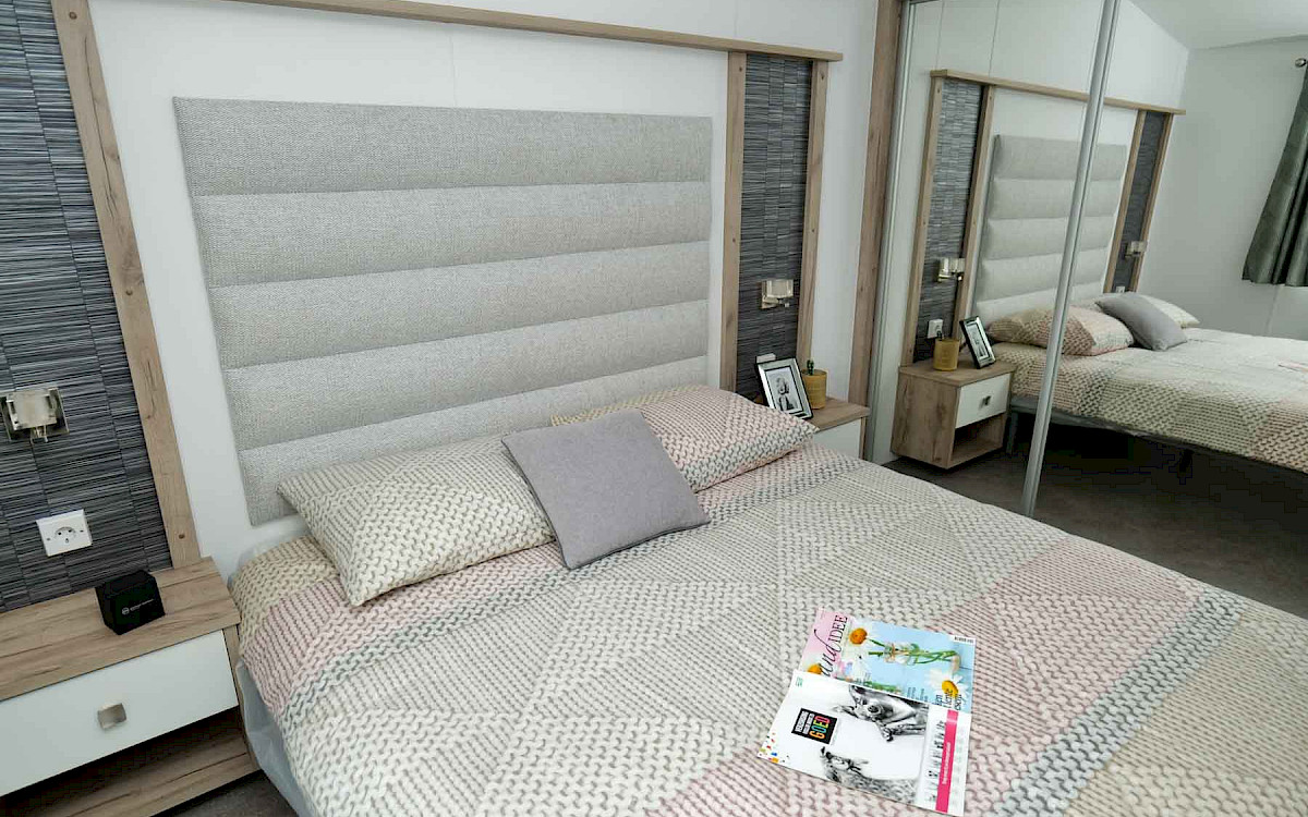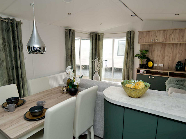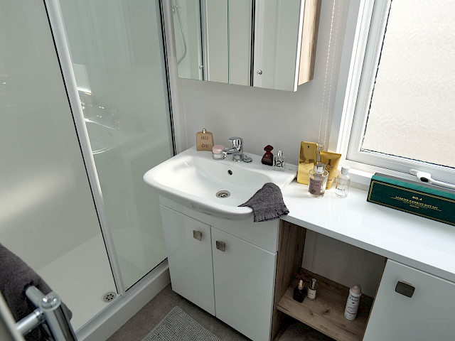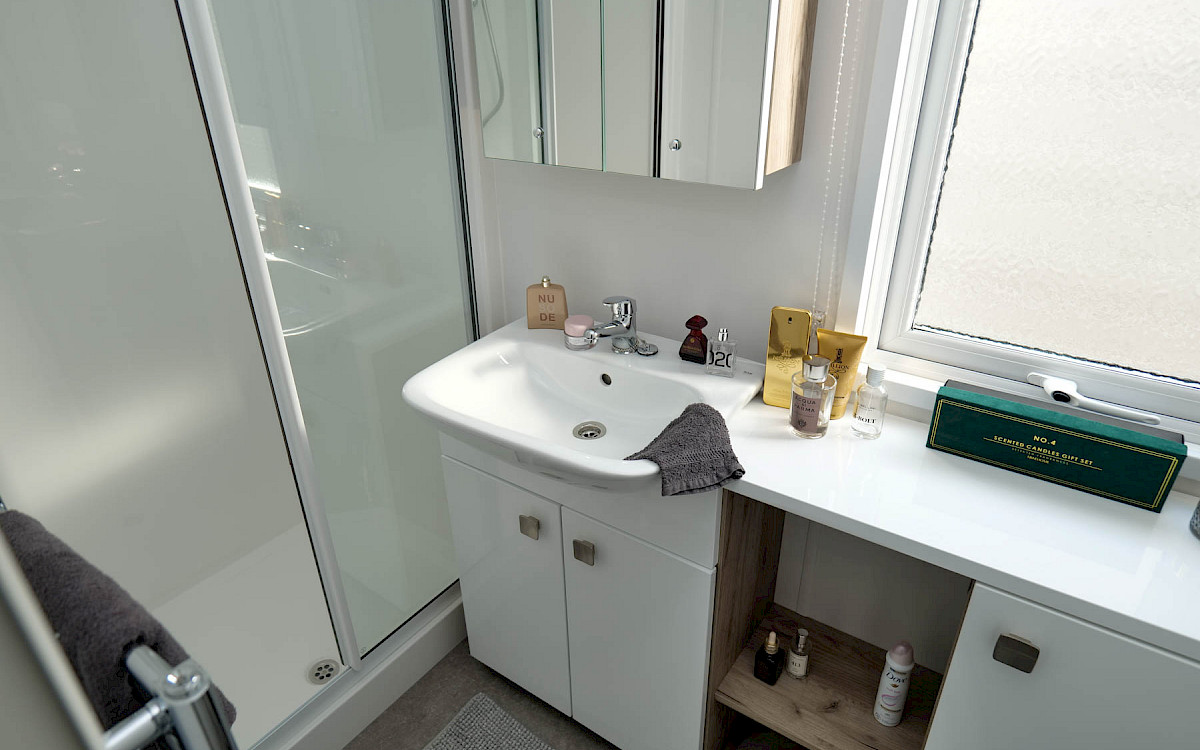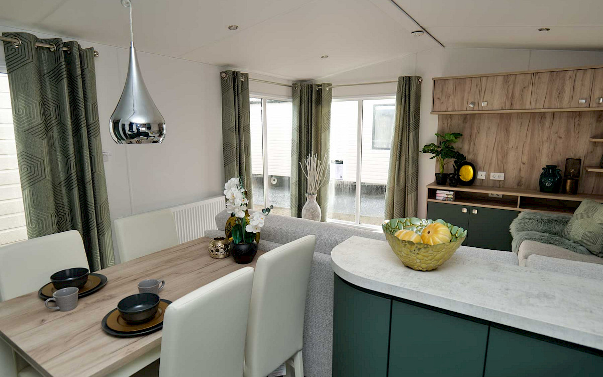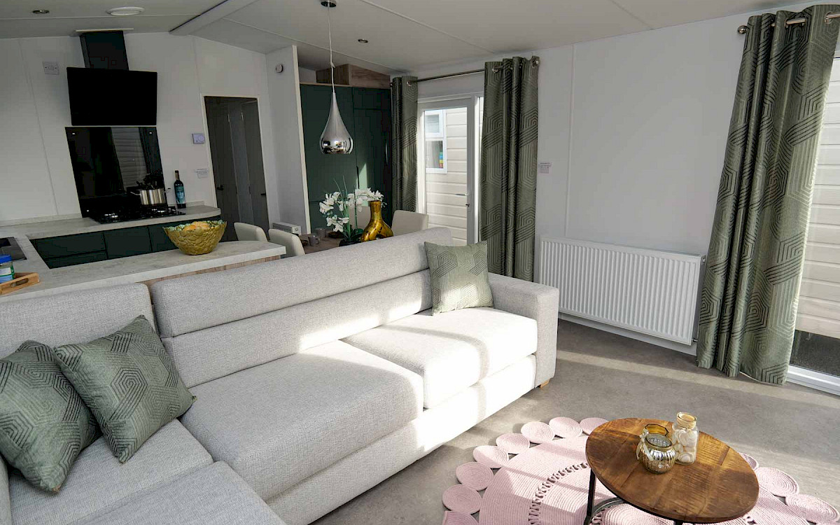 La série Bergjes spéciale Atlantis est un bel ajout à notre gamme. Ce modèle présente un revêtement extérieur gris clair avec des cadres anthracite. La cuisine a une couleur vert foncé chic et est équipée d'une bande LED ! Le grand canapé d'angle est parfait pour une agréable soirée entre amis ou en famille. Et les grandes fenêtres d'angle offrent une belle vue sur votre parc de vacances. Le séjour est séparé des chambres, de la salle de bain et des toilettes séparées par une porte communicante. Bref, la maison de vacances idéale ! Curieux? Venez vite découvrir ce modèle sur notre terrain d'exposition.