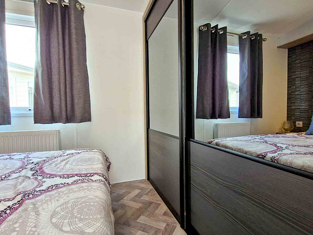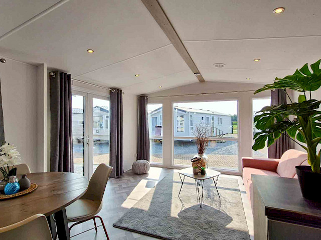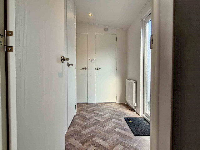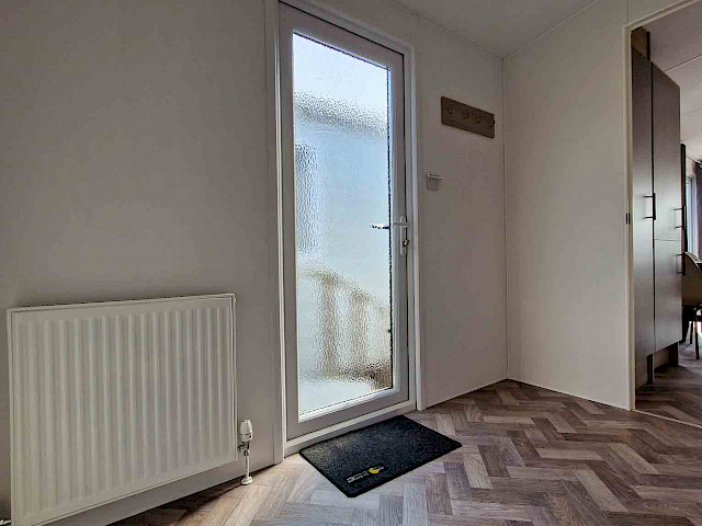 La grande fenêtre à l'avant fournit une abondance de lumière naturelle, ce qui rend la pièce encore plus grande et plus lumineuse. Les doubles portes-fenêtres vous invitent à sortir et à profiter de votre environnement. L'intérieur est entièrement revêtu d'un sol moderne en vinyle à chevrons, qui n'est pas seulement élégant mais aussi facile à entretenir.
