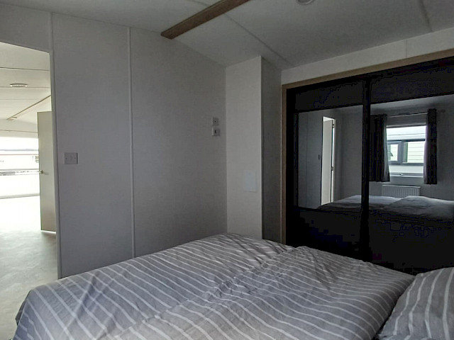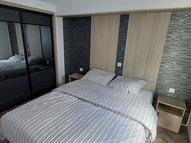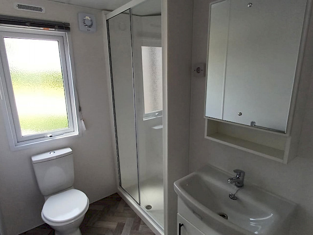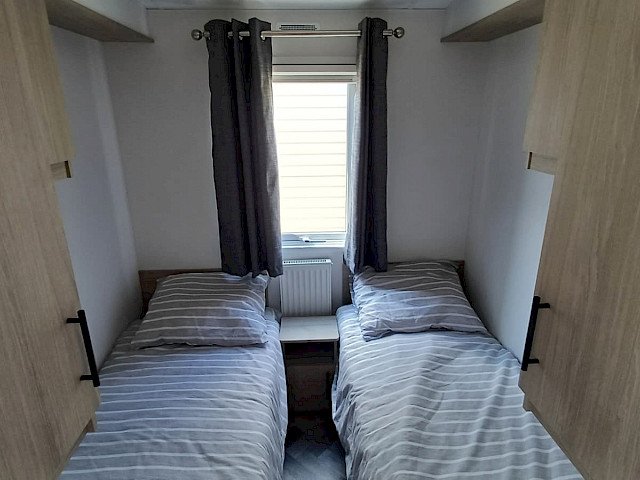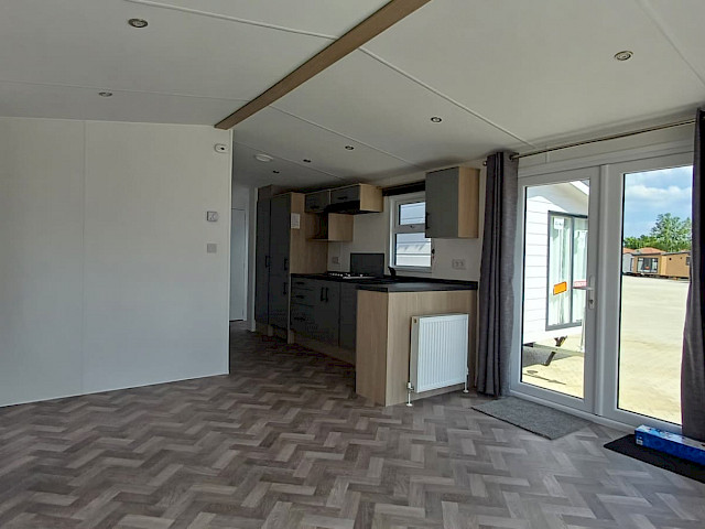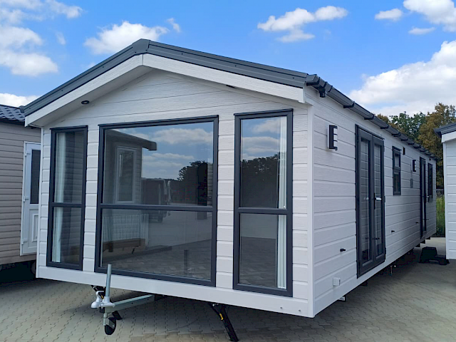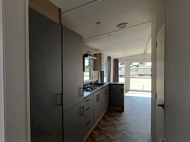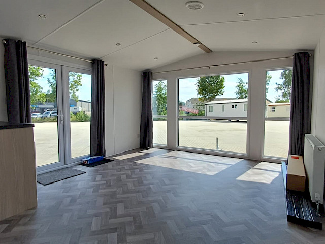 Le mobil-home Ocean offre tout ce dont vous avez besoin pour un séjour confortable. Les grandes fenêtres et portes-fenêtres laissent entrer une lumière naturelle abondante et créent une transition harmonieuse vers l'extérieur. Le revêtement de sol en vinyle élégant à motif chevrons confère une atmosphère moderne et chaleureuse. La cuisine en L aux accents noirs raffinés est équipée d'une cuisinière 4 feux et d'un réfrigérateur/congélateur intégré. L'Ocean dispose également de deux chambres avec suffisamment d'espace de rangement et d'une salle de bains avec une cabine de douche spacieuse et des toilettes.