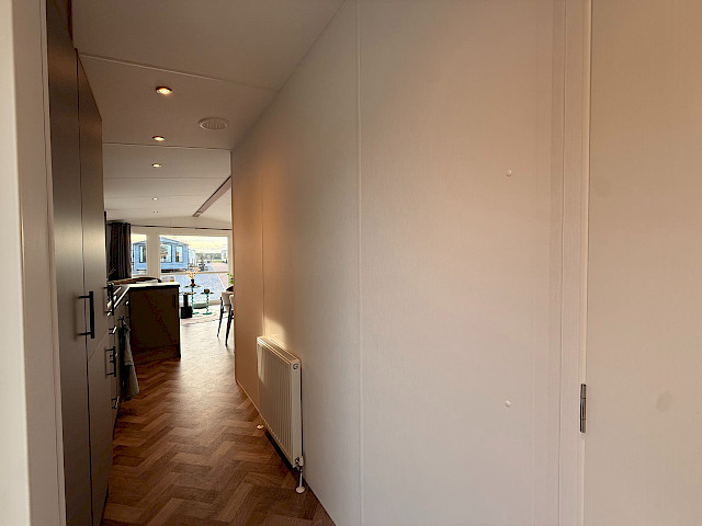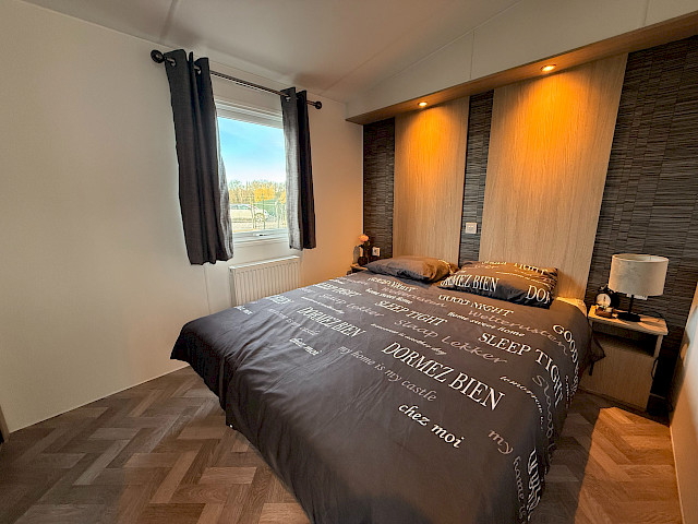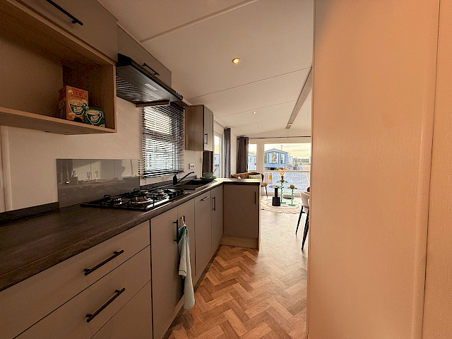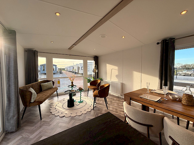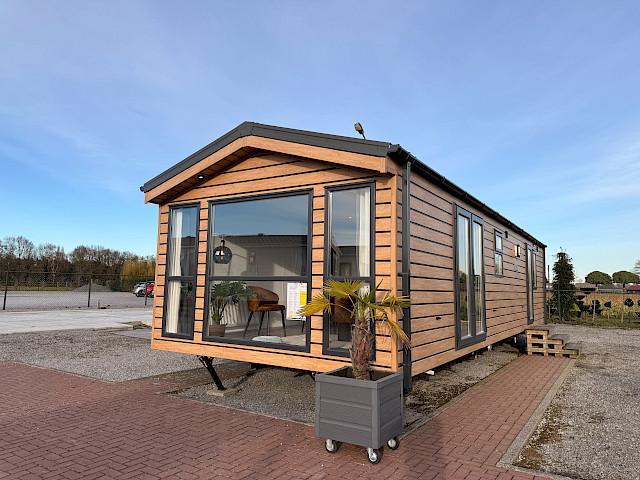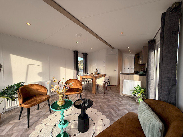 La De Bergjes Série Ocean VinyPlus se distingue par ses grandes fenêtres frontales, ses portes-terrasses latérales et son intérieur luxueux avec un sol en vinyle à motif chevrons.