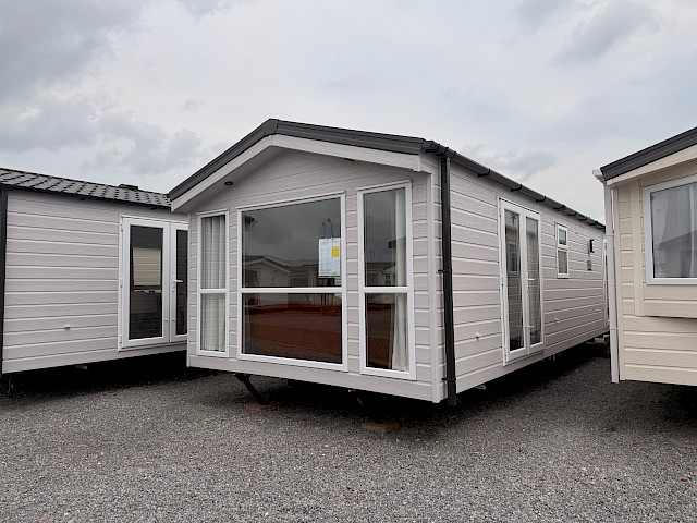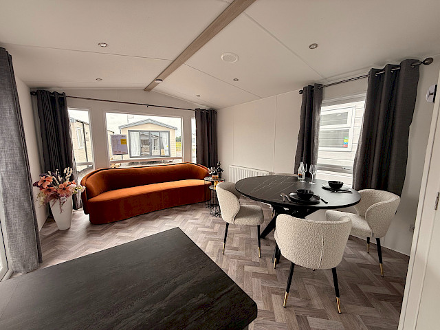 Le mobil-home Ocean offre tout ce dont vous avez besoin pour passer un séjour confortable. Les grandes fenêtres et portes-patio offrent une abondance de lumière naturelle et une transition fluide vers l'extérieur. L'élégant revêtement de sol en vinyle au motif à chevrons donne un aspect moderne et chaleureux. La cuisine en forme de L aux élégants accents noirs est équipée d'une cuisinière à 4 feux et d'un réfrigérateur/congélateur intégré. De plus, l'Ocean offre deux chambres avec suffisamment d'espace de rangement et une salle de bain avec une cabine de douche spacieuse et des toilettes.