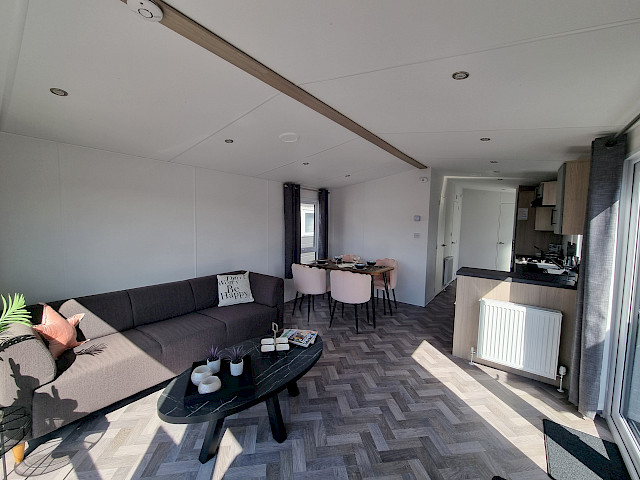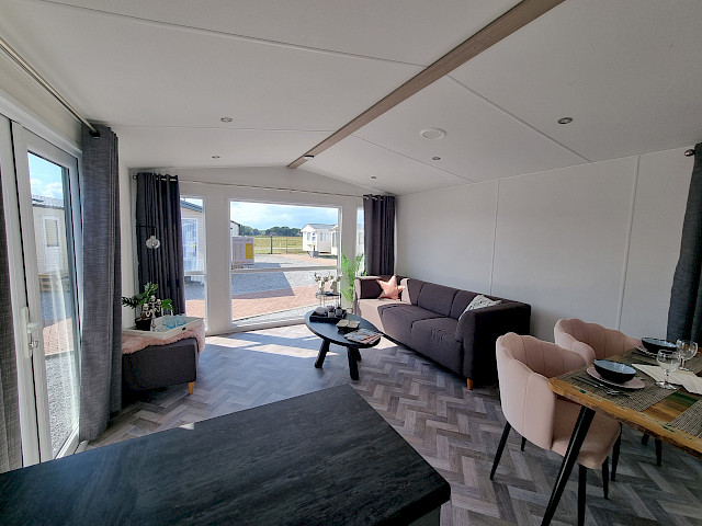 La grande fenêtre à l'avant fournit une abondance de lumière naturelle, ce qui rend la pièce encore plus grande et plus lumineuse. Les doubles portes-fenêtres vous invitent à sortir et à profiter de votre environnement. L'intérieur est entièrement revêtu d'un sol moderne en vinyle à chevrons, qui n'est pas seulement élégant mais aussi facile à entretenir.