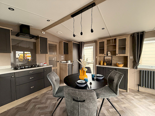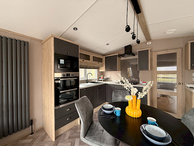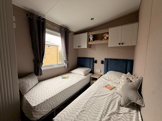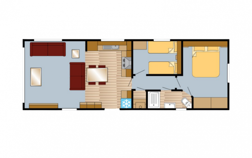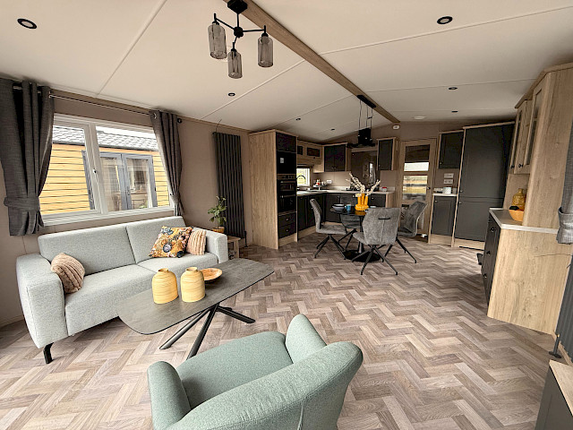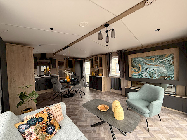 Découvrez la série Redwood de De Bergjes : notre modèle haut de gamme qui allie luxe, espace et chaleur dans un mobil-home au design bien pensé. L'agencement ouvert avec baie vitrée coulissante, sol en vinyle, plafond suspendu et cheminée électrique crée un espace de vie moderne et accueillant où l'on se sent immédiatement chez soi. La cuisine en L entièrement équipée, avec four intégré, micro-ondes, lave-vaisselle et réfrigérateur-congélateur, facilite la préparation des repas au quotidien. Avec deux chambres, dont une spacieuse chambre principale avec salle de bains attenante, vous bénéficiez d'un confort haut de gamme. Le modèle est non meublé, mais équipé de rideaux, afin que vous puissiez l'aménager à votre goût.
