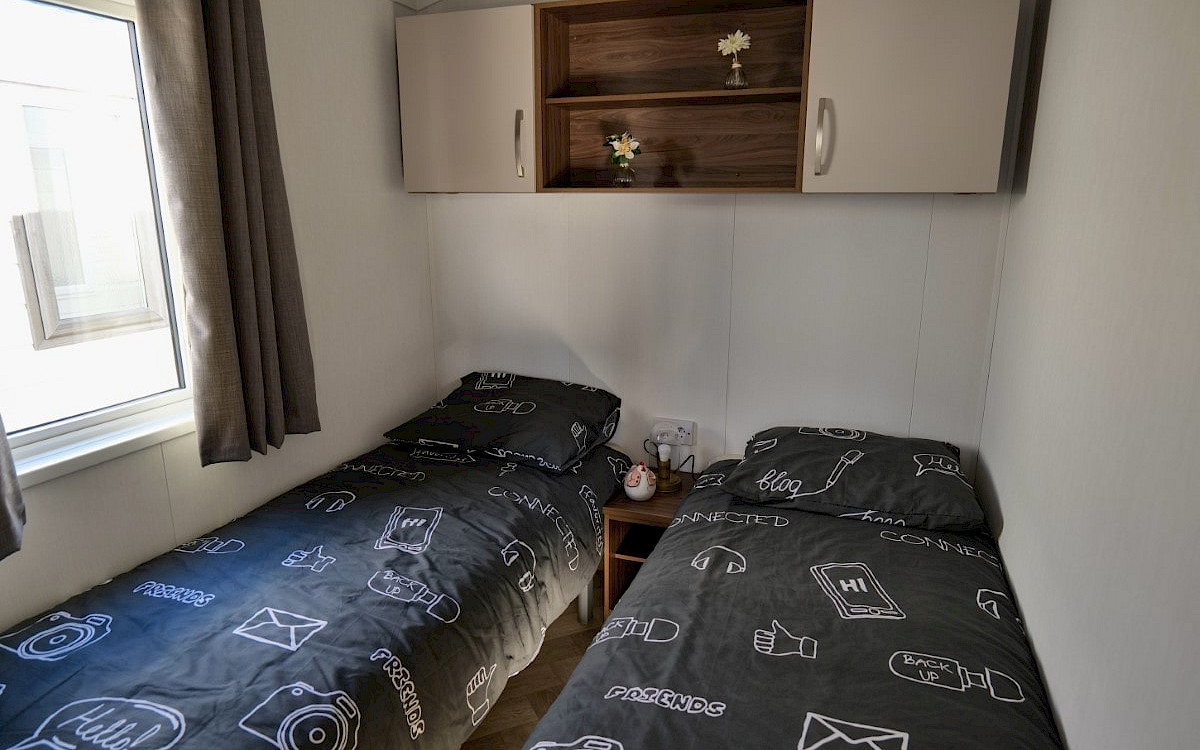 Lorsque vous choisissez l'ensemble de meubles Willerby Lumic, vous obtenez des rideaux gris dans les chambres, des rideaux panachés dans le salon, une table de salle à manger avec 4 chaises, un canapé-lit, un hocker, un meuble TV, une table basse et un cadre de lit dans la chambre principale.