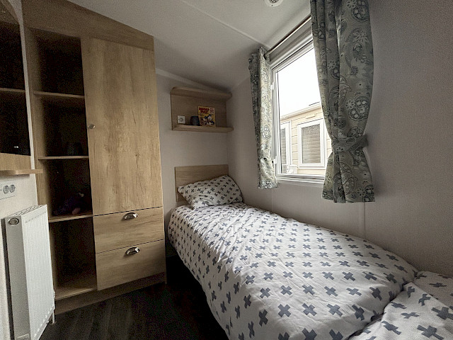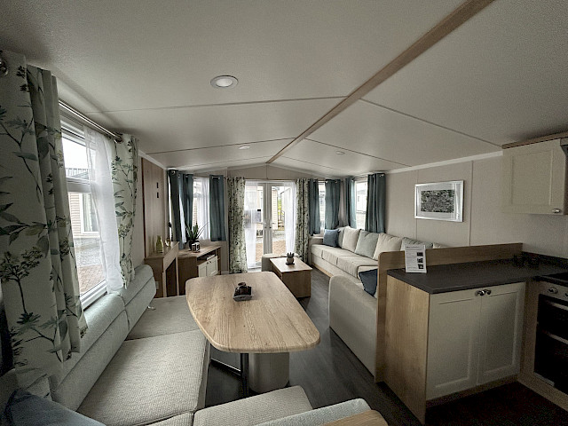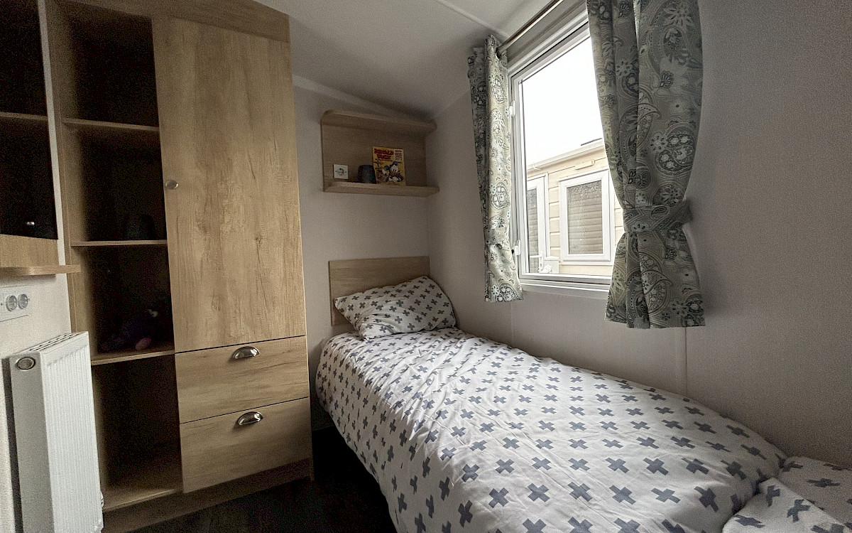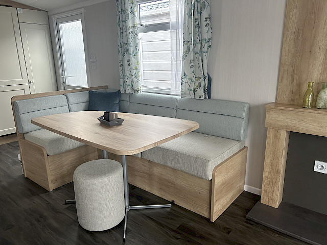 Le Swift Burgundy a un design intemporel et pratique. Le rembourrage botanique et les portes de jardin à l'avant de ce chalet de vacances font entrer la nature de l'extérieur. Le Burgundy n'est donc pas l'un des modèles de loisirs les plus populaires de Swift pour rien. L'agréable salon avec cheminée électrique et la spacieuse cuisine en U constituent un cadre de vie idéal pour votre séjour de vacances. Les chambres sont équipées de matelas de luxe et dans la petite chambre, un lit peut être rangé sous l'autre pour plus d'espace. Vous êtes curieux de découvrir ce modèle ? N'hésitez pas à visiter notre site d'exposition et à découvrir ce modèle.