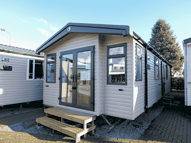 Le Swift Burgundy a un design intemporel et pratique. Le rembourrage botanique et les portes de jardin à l'avant de ce chalet de vacances font entrer la nature de l'extérieur. Le Burgundy n'est donc pas l'un des modèles de loisirs les plus populaires de Swift pour rien. L'agréable salon avec cheminée électrique et la spacieuse cuisine en U constituent un cadre de vie idéal pour votre séjour de vacances. Les chambres sont équipées de matelas de luxe et dans la petite chambre, un lit peut être rangé sous l'autre pour plus d'espace. Vous êtes curieux de découvrir ce modèle ? N'hésitez pas à visiter notre site d'exposition et à découvrir ce modèle.