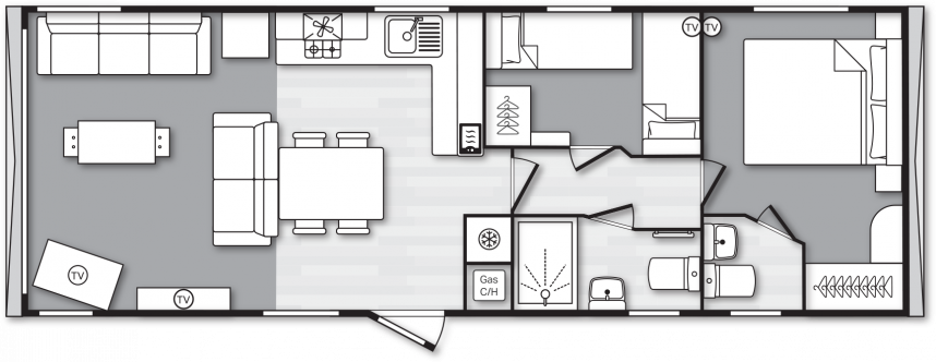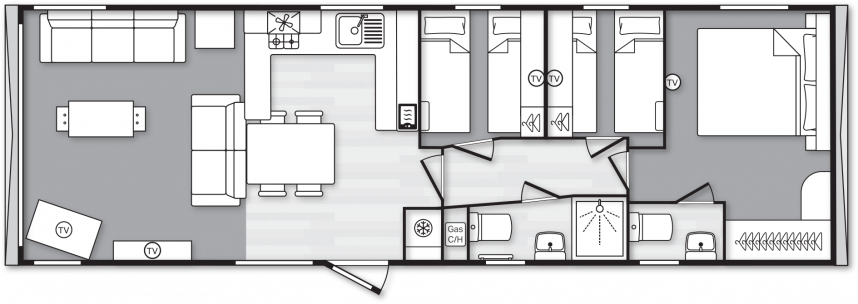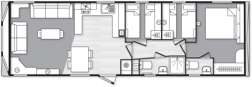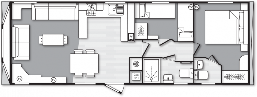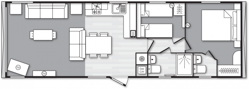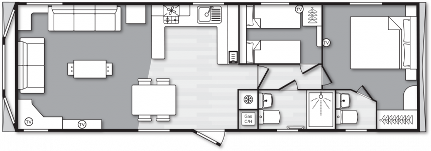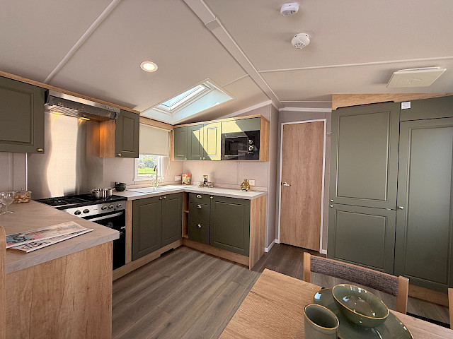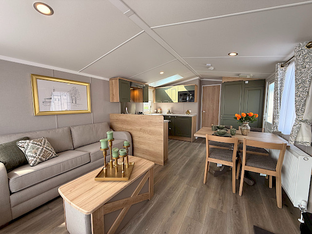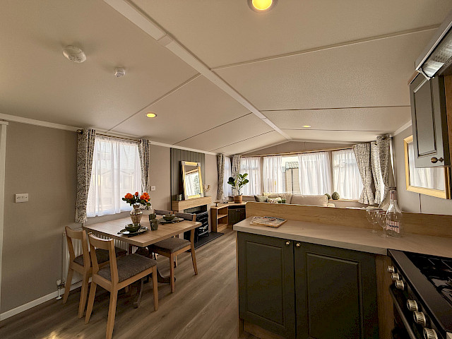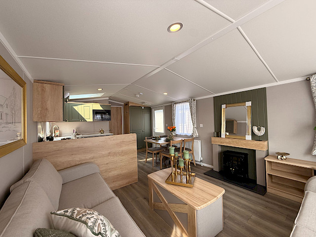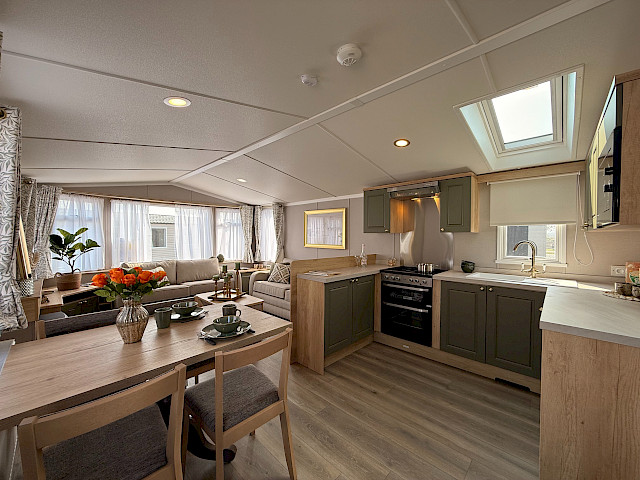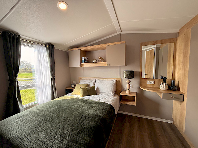 Dès que vous entrez dans le Swift Provence, vous vous sentez immédiatement à l'aise. L'agencement est parfaitement pensé : le salon, le coin repas et la cuisine s'enchaînent de manière fluide. Les canapés, la table, les chaises et la cheminée d'appoint sont inclus et créent immédiatement une ambiance chaleureuse. Des extras pratiques sont déjà intégrés sans que vous les voyiez, comme les sièges sous la table basse et le lit d'appoint que vous pouvez sortir du canapé si nécessaire. La cuisine est agencée en L ou en U, selon la taille du mobil-home, et est équipée d’une cuisinière, d’un four, d’un micro-ondes et d’un réfrigérateur-congélateur. La chambre principale dispose même d’une salle de bains attenante, ce qui rend l’agencement étonnamment pratique pour un usage quotidien ou lorsque vous recevez des invités.
